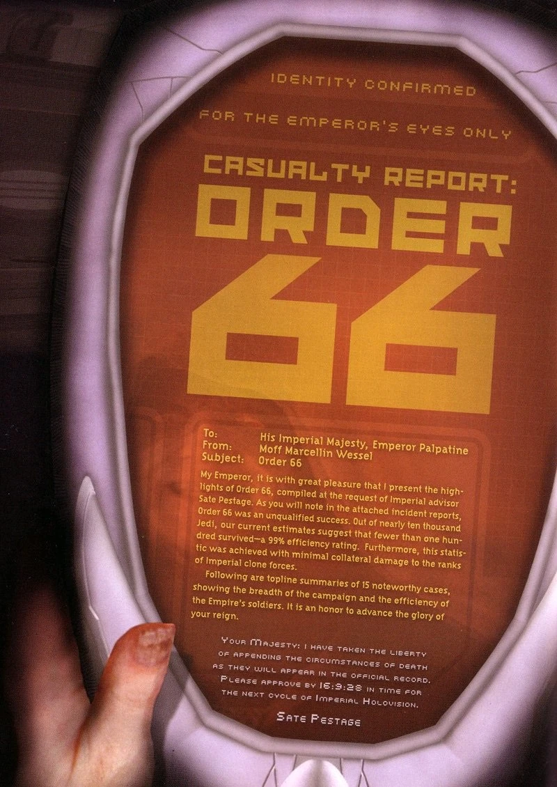 Order 66: In the event of Jedi officers acting against the interests of the Republic, and after receiving specific orders verified as coming directly from the Supreme Commander (Chancellor), GAR commanders will remove those officers by lethal force, and command of the GAR will revert to the Supreme Commander (Chancellor) until a new command structure is established.