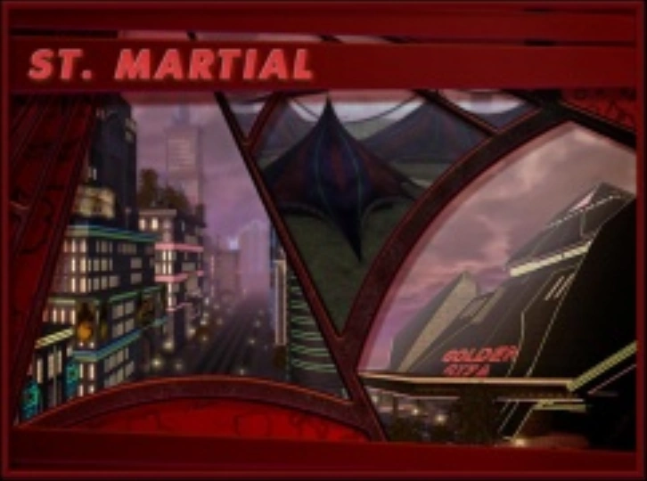 St. Martial is a bevy of private business and the site of the illustrious Golden Giza Casino. Though the Giza is officially owned by a cut-out everyone knows in truth the main entertainer, Johnny Sonata, runs the place. Sonata sold his soul for his golden voice years ago and is holding out on paying up the Wailer Demons he made the pact with, as a result the Wailers have appeared in St. Martial to collect on the dept. Arachnos has given Johnny Sonata the aid of their Mu mystics to place massive demonic wards around the Golden Giza. The Mu wards around the Giza make it the only place on the isle untouchable to the Wailers protecting Johnny from his demonic creditors. In anger over Sonata's evasion from them the Wailers plague most other parts of the isle in protest. Johnny Sonata has become Arachnos' main supporter in St. Martial so money is funneled to Arachnos from the massive vacation spot. While there is an Arachnos military base to the south west of St. Martial, the rest of the island surrounding the Golden Giza has become a massive tourist trap siphoning off what money it can from the casino's patrons. Most of the businesses surrounding the Giza pay protection money or are outright fronts to the Family, who maintain the area as figurative and literal gangster's paradise.