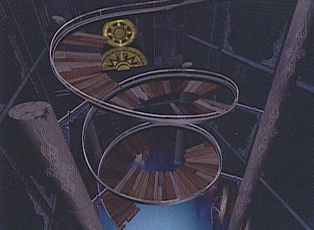 The arena features a large open central area with 4 tall pillars in the corners and a spiral wooden platform with railings. The wooden platforms are destructible, and also break if a character stands on them too long. The side of the area has a long alcove lined with gears, and the top has a small balcony that can be destroyed if a character is knocked into it. This stage is notably the only one to have a banish trap set in the ceiling as well as in the ground. In the stage's Ω version, at times during a battle the screen will blur as Time Compression magic takes effect: any destroyed platforms will reverse and reform, the gears will begin to spin, damaging any character that touches them, and the Bravery pool rapidly randomizes. After a period of time the effects end and the stage returns to normal.